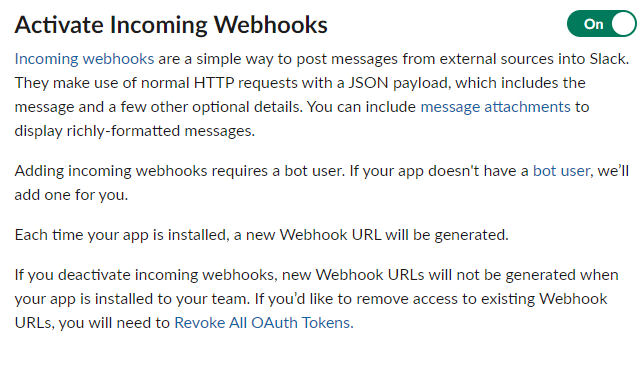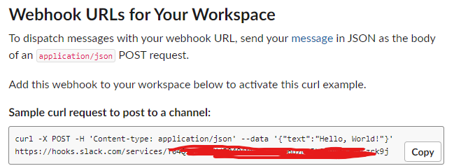 우측 상단에 On으로 토글을 표시하고 Add New Webhook to Workspace 가 나오는데 알림을 받고자 하는 채널을 설정하고 Sample Url을 보내면 해당 채널로 메시지가 온다