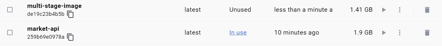 - 이전 스테이지에서 설치된 바이너리 파일을 현재 스테이지에 옮기는 COPY --FROM= 명령에 대한 이해도가 부족해서 그냥 COPY 를 떠버렸다. 그랬더니 위의 아래 이미지처럼 용량이 꽤 크게 나왔다. 위의 같은 경량화 이미지를 썼음에도 약 2배 차이가 났다.