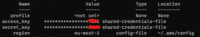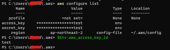 내 경우에는 언제 등록했는지는 모르겠는데 환경변수로 access_key_id 가 test로 저장되어 있었다.