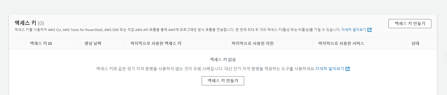 우선 우측 상단에 계정 이름을 눌러서 보안 자격 증명에 들어가자. 그다음 아래로 스크롤하면 '액세스키 만들기'를 클릭하자