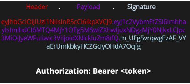 '.'을 구분 문자로 헤더, 내용(payload), 서명 부분을 Base64 URL로 인코딩 되어 표현된다.