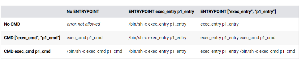 아래 표는 다양한 ENTRYPOINT/CMD 조합에 대해 실행되는 명령이 나와 있다.